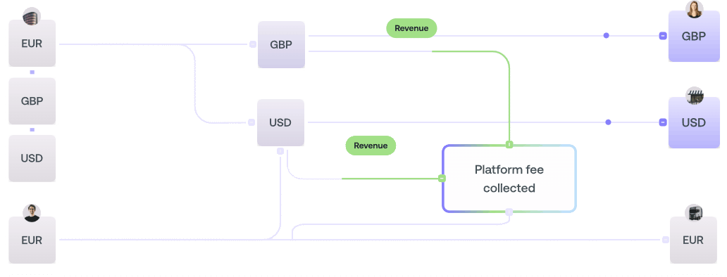 Capture more revenue from the same payment volumes through FX margins and wallet transactions. No upsell. Same flows, now monetizable.